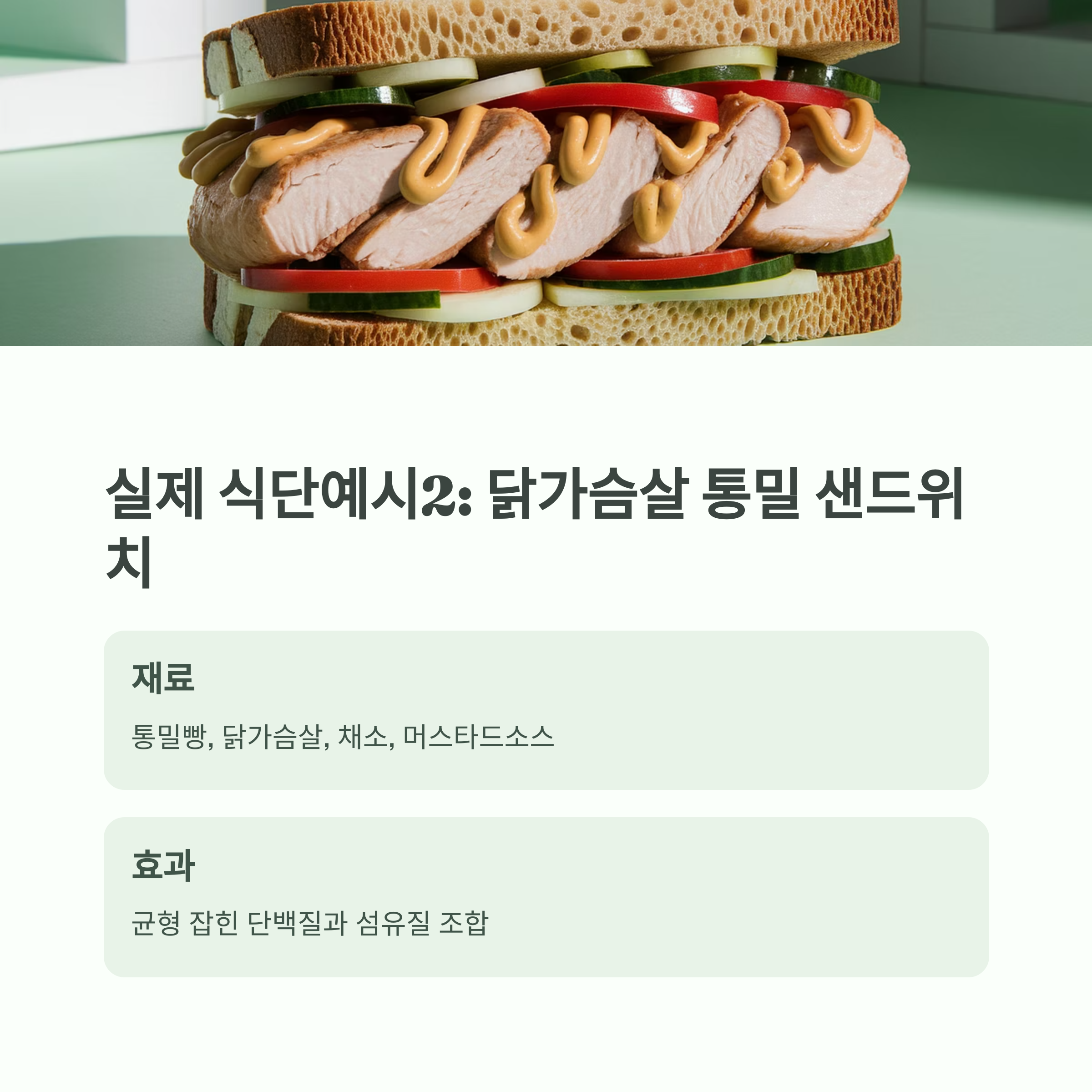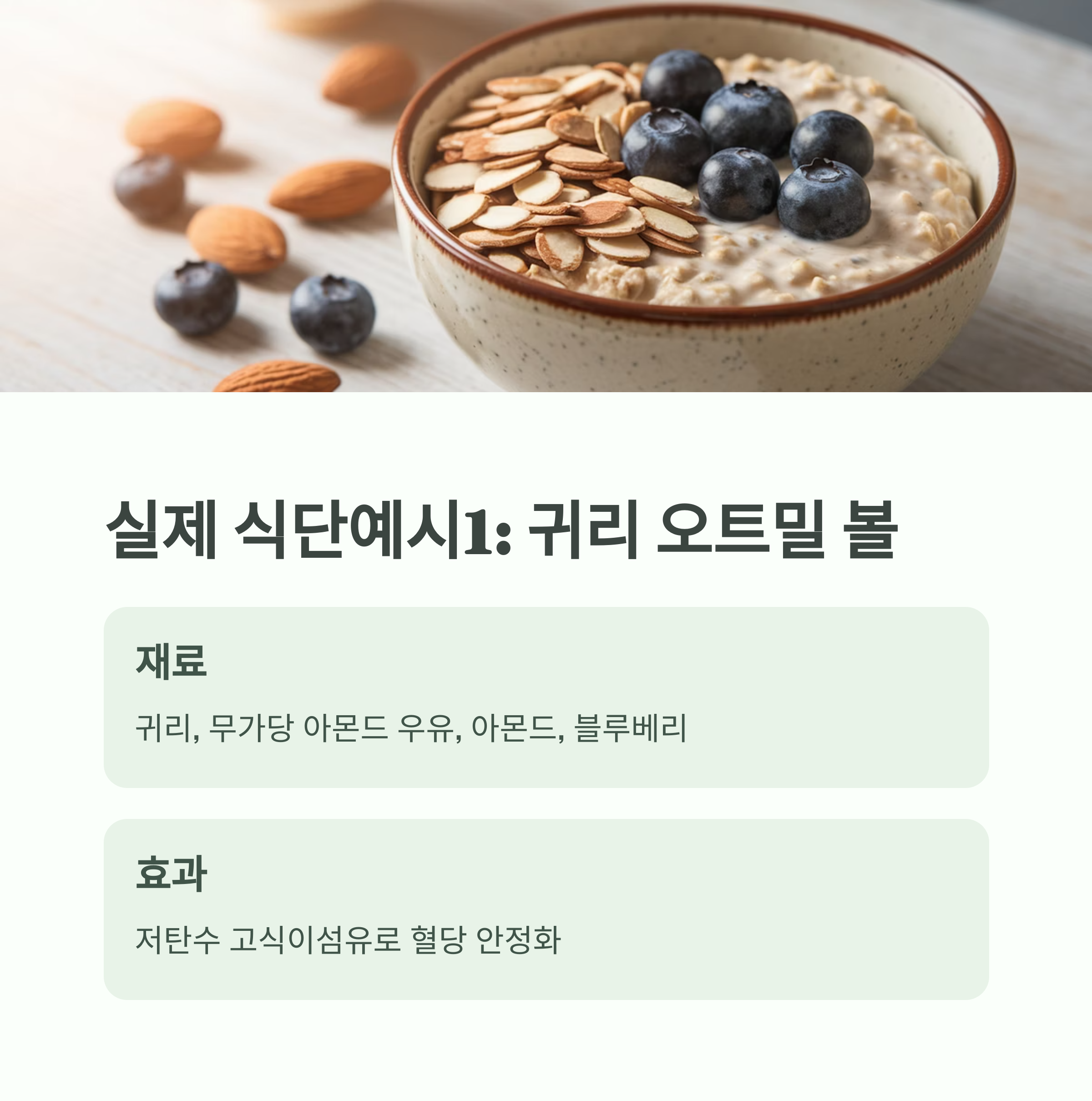 식단 예시로는 통밀 토스트에 아보카도와 삶은 달걀을 곁들인 조합, 두부와 채소가 들어간 된장국과 현미밥 구성, 귀리 오트밀 위에 견과류와 블루베리를 올려 먹는 방법 등이 있습니다. 이러한 식사는 준비가 간편하면서도 영양소가 균형 있게 들어 있어 혈당 조절에 큰 도움을 줄 수 있습니다.