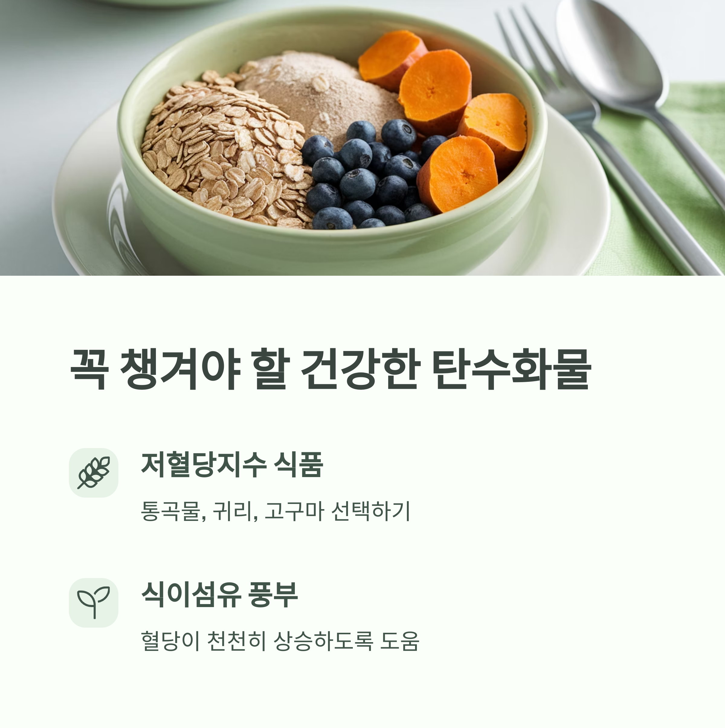 | 빠른 혈당 상승 유발 | 천천히 소화되고 혈당 안정화 | 포만감 유지 및 혈당 급등 방지 |