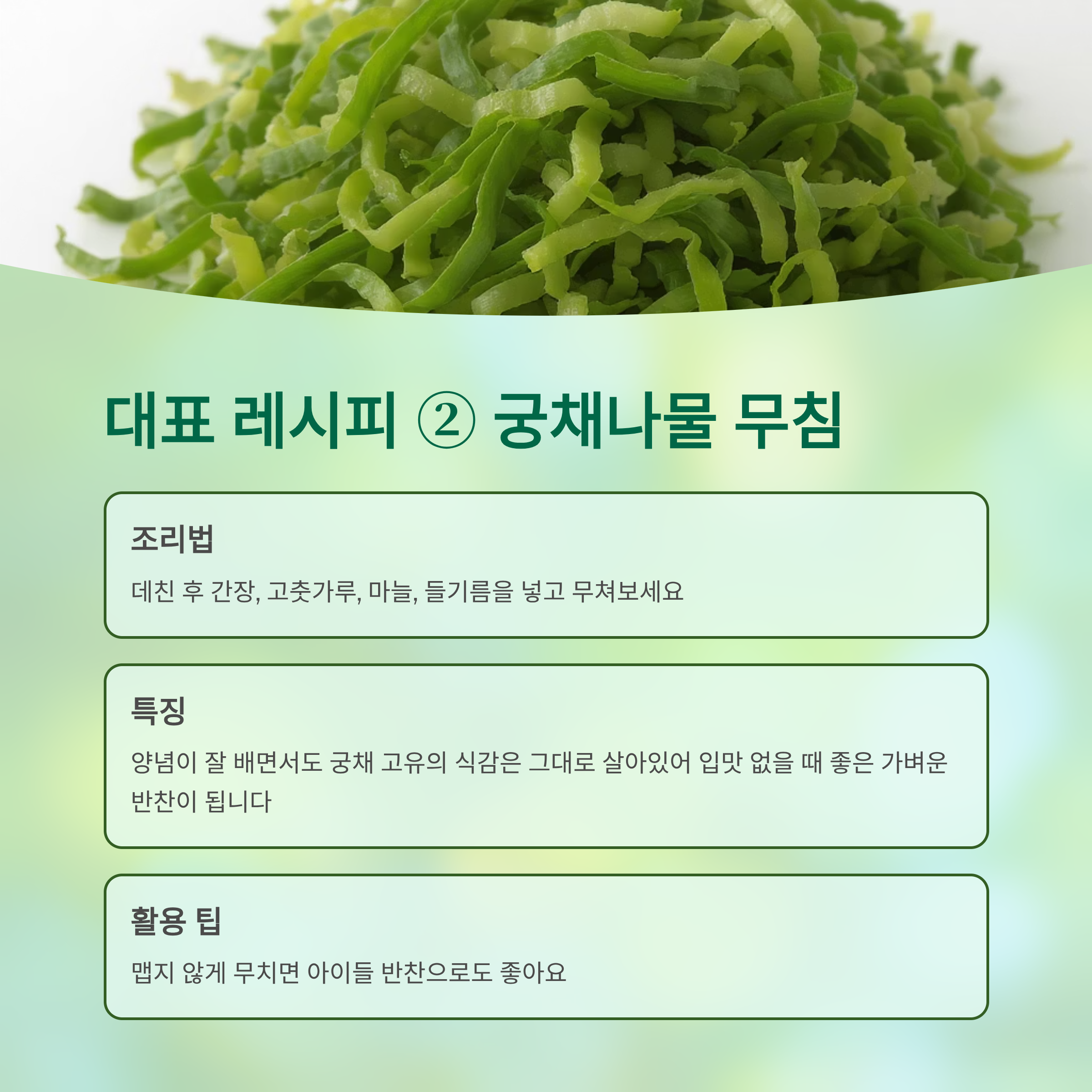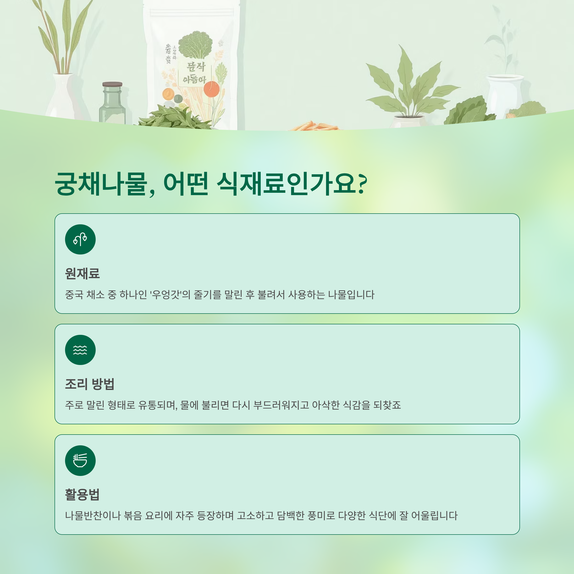궁채나물은 중국 채소 중 하나인 '우엉갓'의 줄기를 말린 후 불려서 사용하는 나물입니다. 주로 말린 형태로 유통되며, 물에 불리면 다시 부드러워지고 아삭한 식감을 되찾죠.