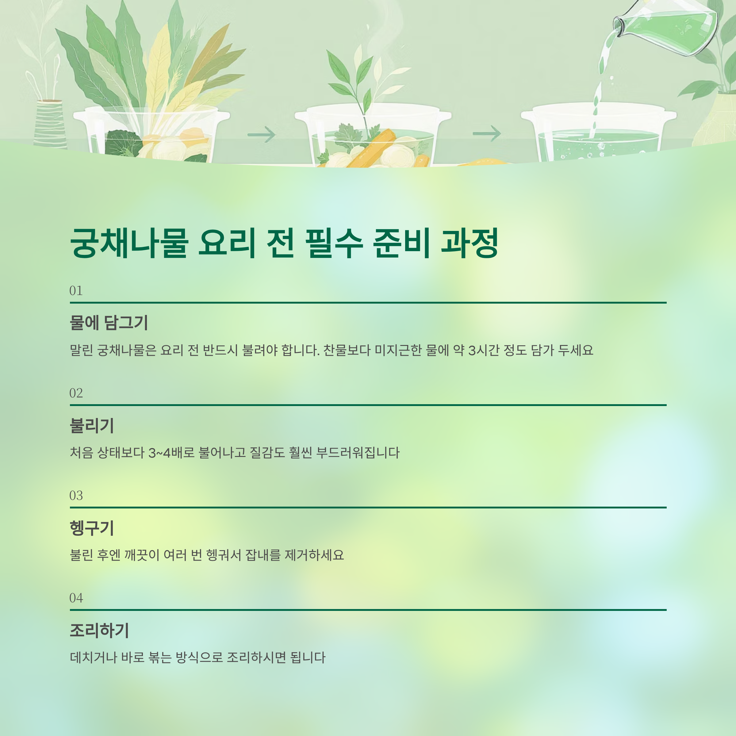 말린 궁채나물은 요리 전 반드시 불려야 합니다. 찬물보다 미지근한 물에 약 3시간 정도 담가 두면, 처음 상태보다 3~4배로 불어나고 질감도 훨씬 부드러워지죠.