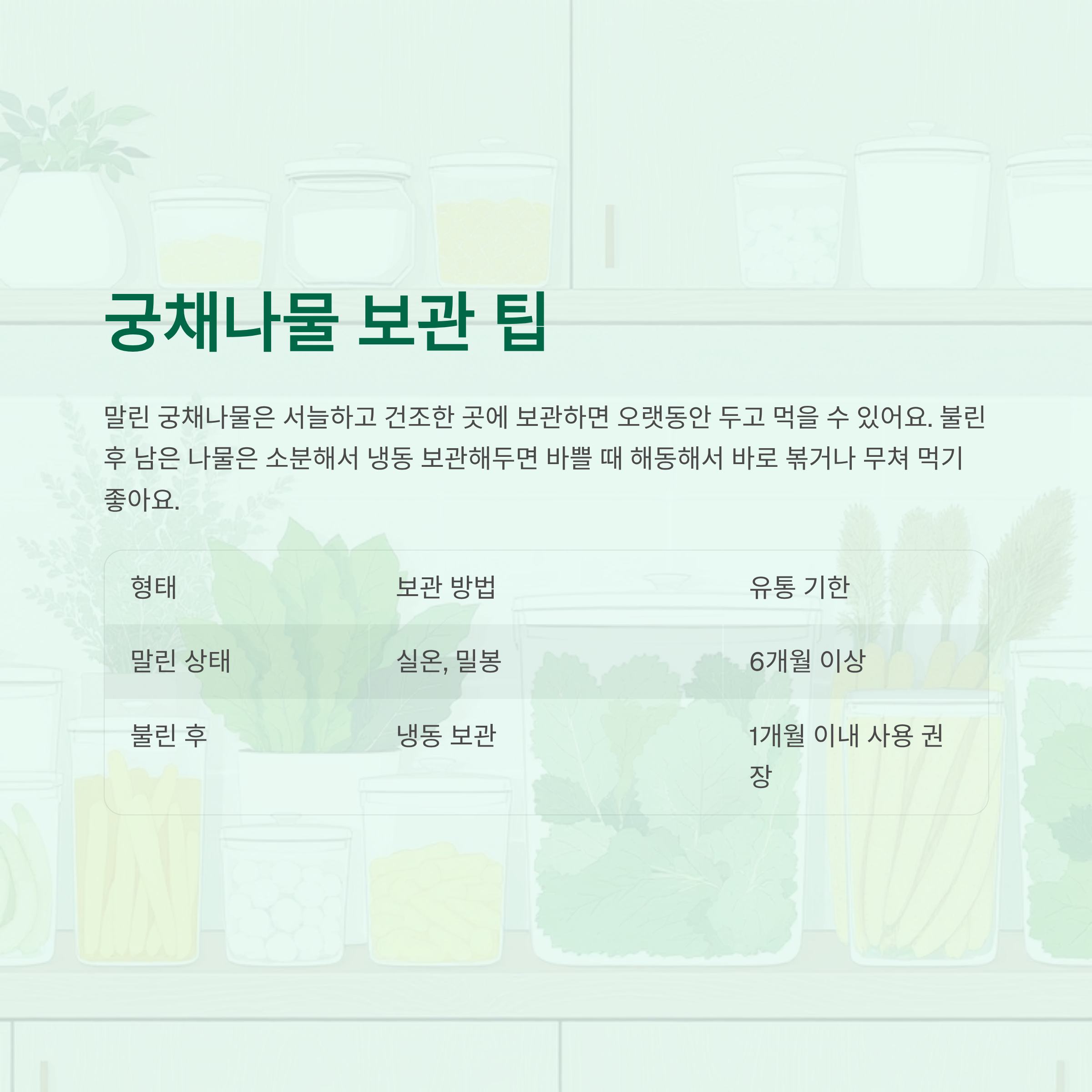 말린 궁채나물은 서늘하고 건조한 곳에 보관하면 오랫동안 두고 먹을 수 있어요. 불린 후 남은 나물은 소분해서 냉동 보관해두면 바쁠 때 해동해서 바로 볶거나 무쳐 먹기 좋아요.