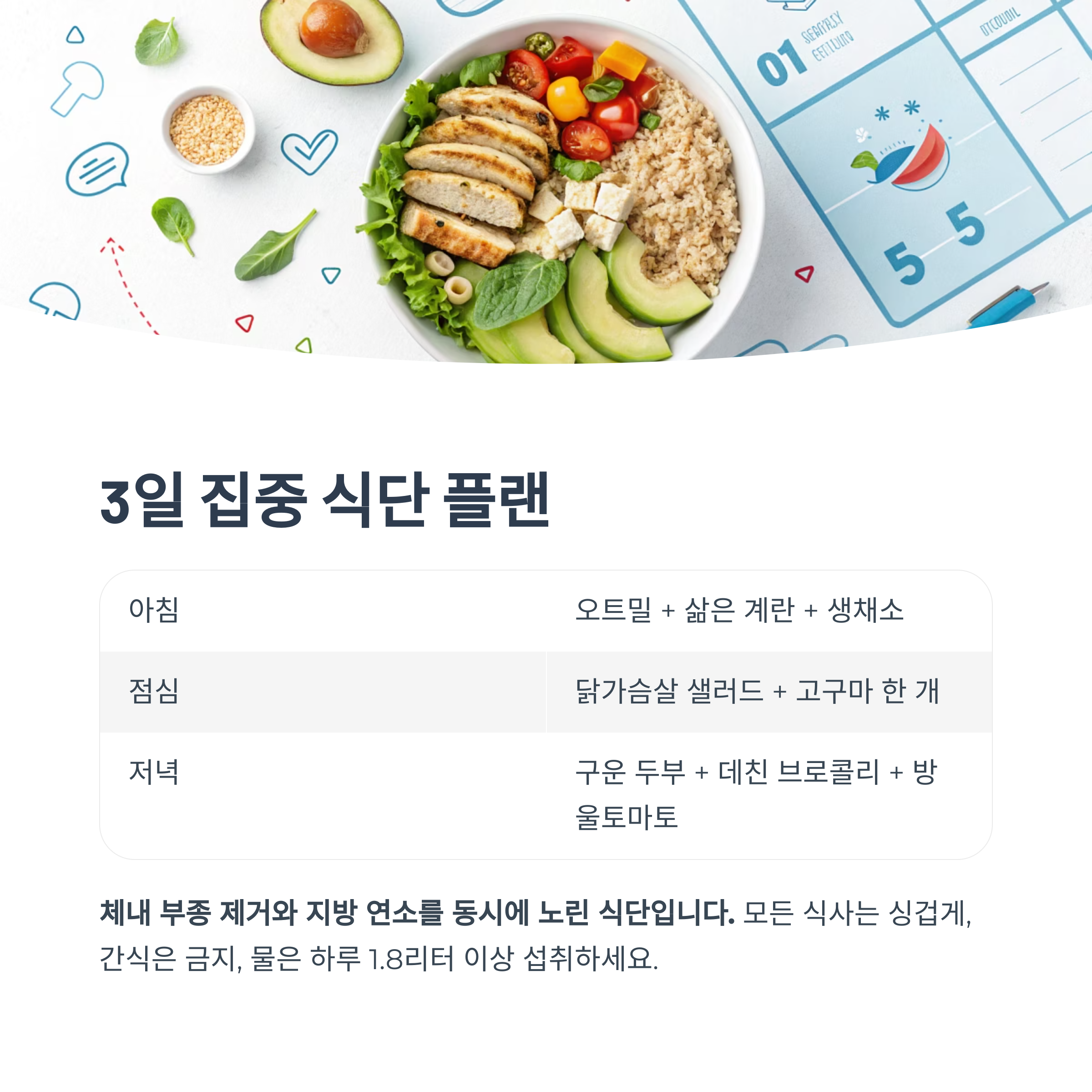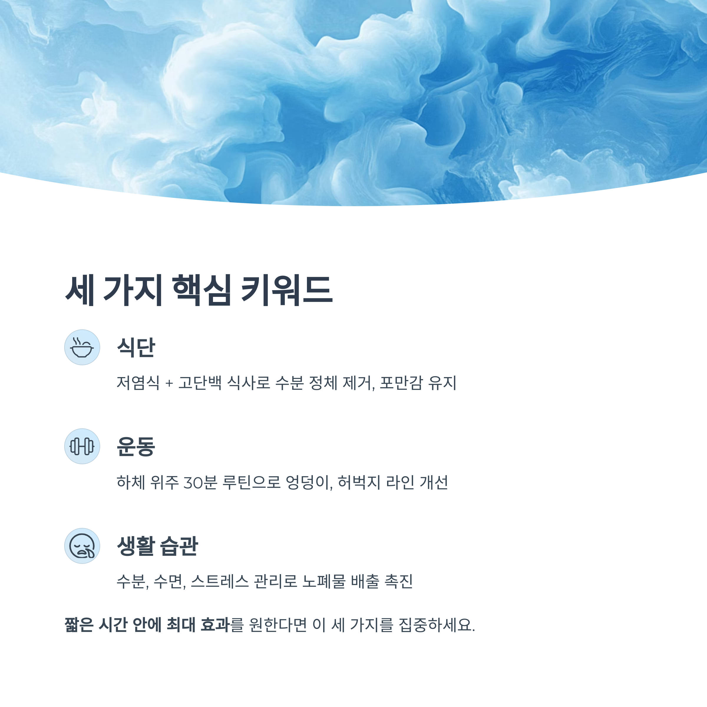 | 식단 | 저염식 + 고단백 식사 | 수분 정체 제거, 포만감 유지 |