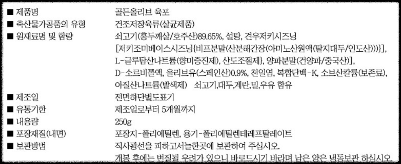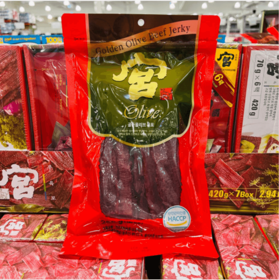 다이어트 중에는 입이 심심해지는 때가 있습니다. 이럴 때, 필수 영양소인 단백질을 제공하면서도 씹는 맛을 즐길 수 있는 간식으로 육포를 추천드립니다. 하지만 편의점이나 슈퍼마켓에서 쉽게 구할 수 있는 육포는 나트륨이나 지방 함량이 높아 다이어트 간식으로 먹기 어렵습니다. 그래서 오늘은 덜 짜고 저지방, 고단백의 영양 간식인 궁 골든 올리브 육포 250g을 소개하고자 합니다.