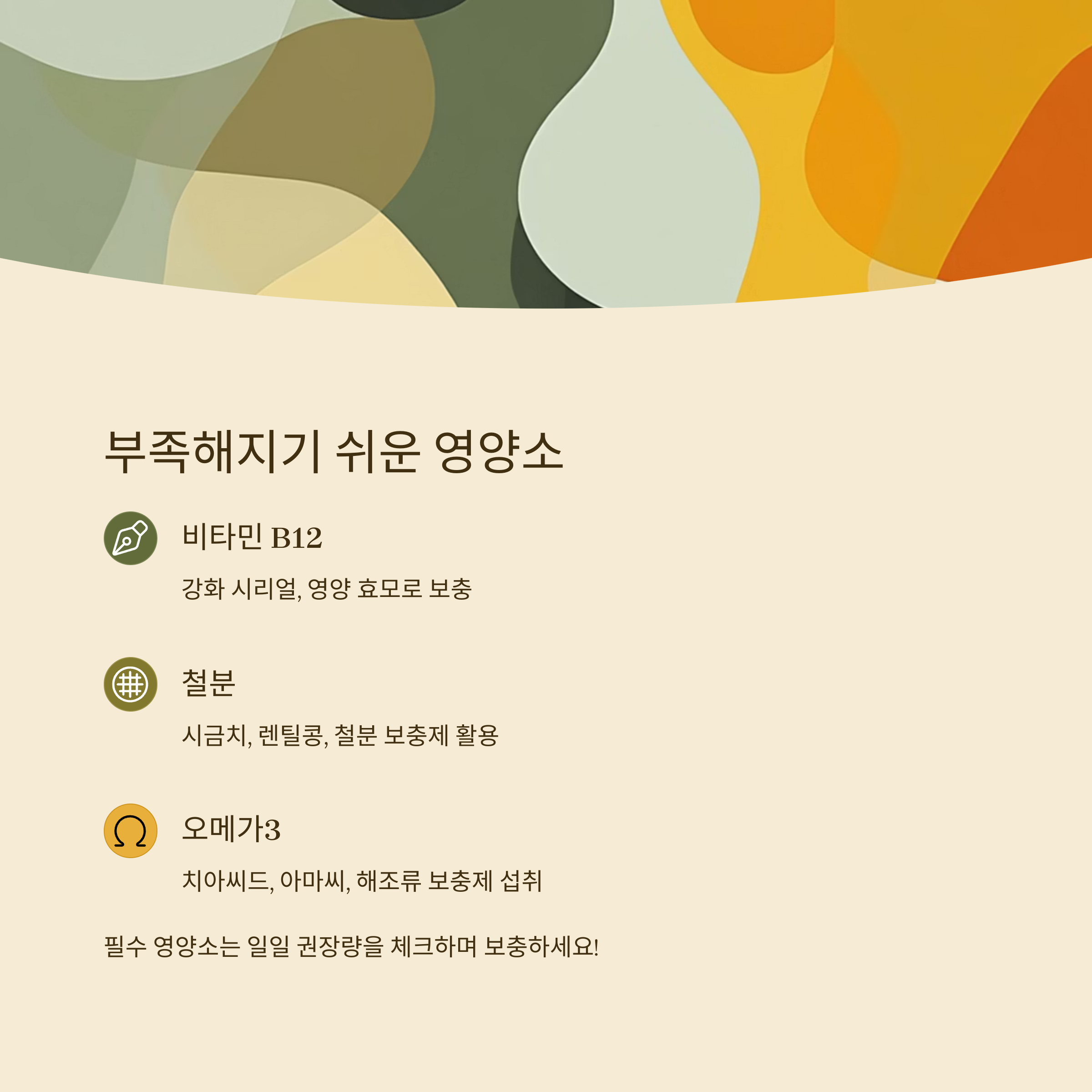 특히 비타민 B12, 철분, 오메가 3은 동물성 식품에 풍부하므로, 보충이 필수적입니다.