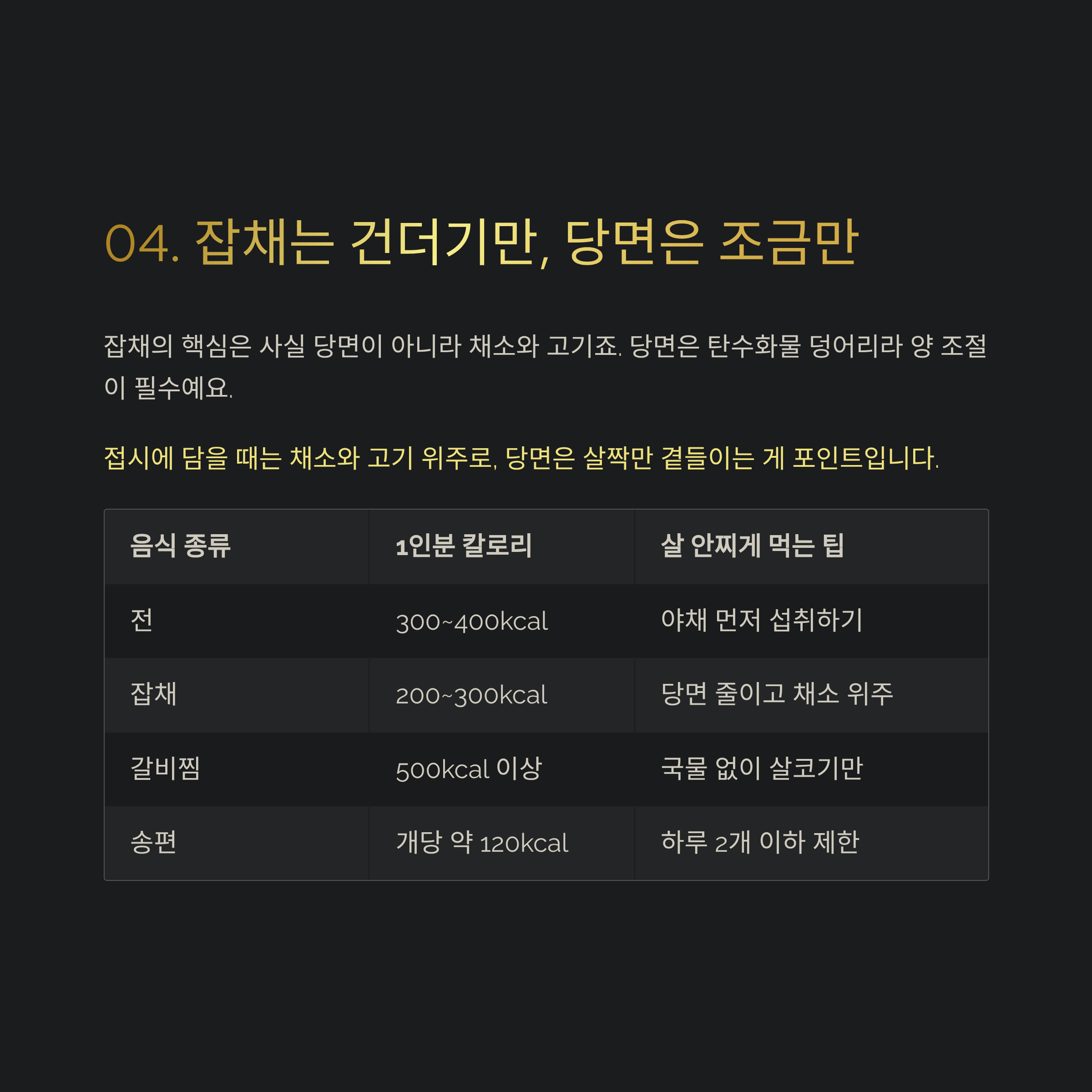 | 잡채 | 200~300kcal | 당면 줄이고 채소 위주 |