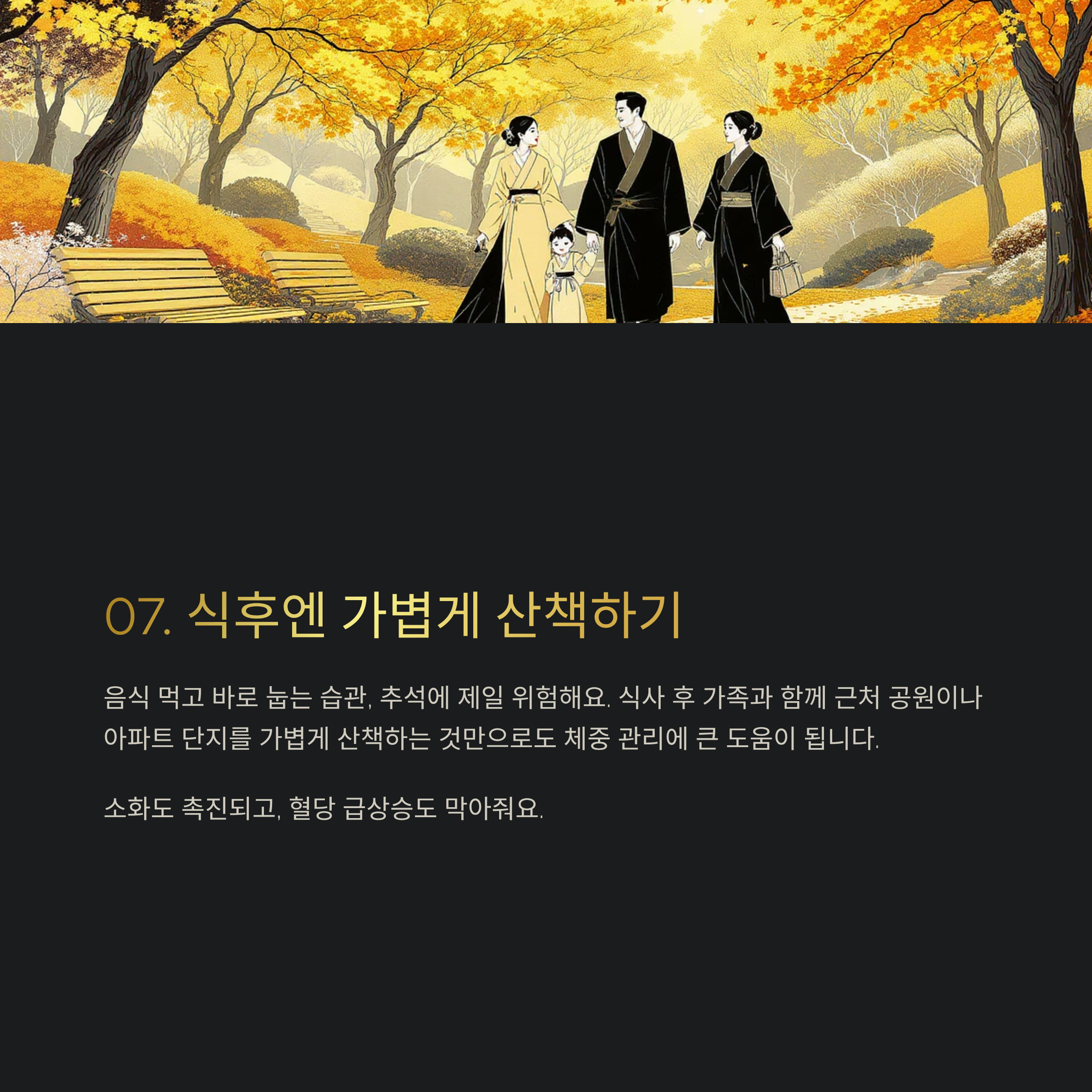 음식 먹고 바로 눕는 습관, 추석에 제일 위험해요. 식사 후 가족과 함께 근처 공원이나 아파트 단지를 가볍게 산책하는 것만으로도 체중 관리에 큰 도움이 됩니다.
