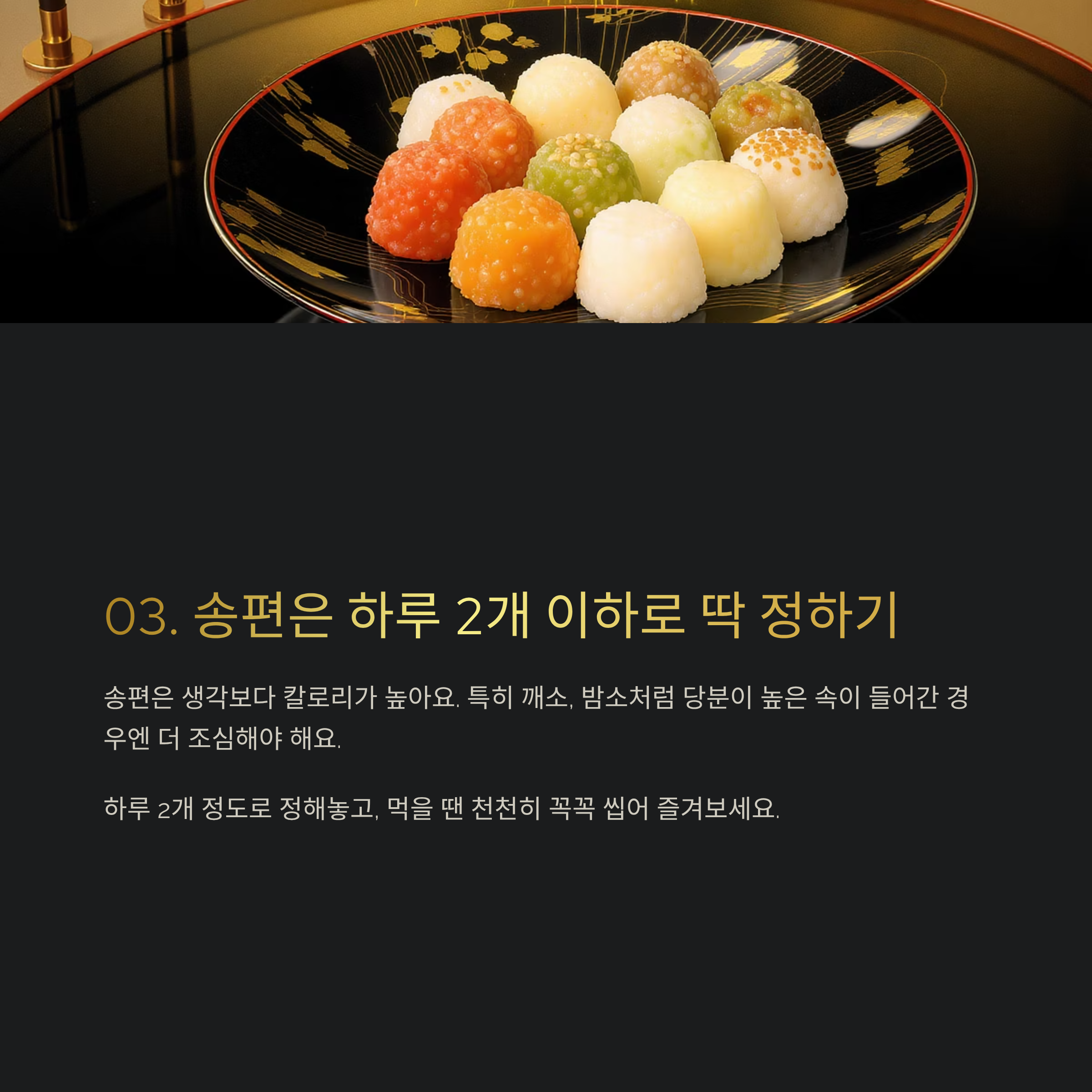 | 송편 | 개당 약 120kcal | 하루 2개 이하 제한 |