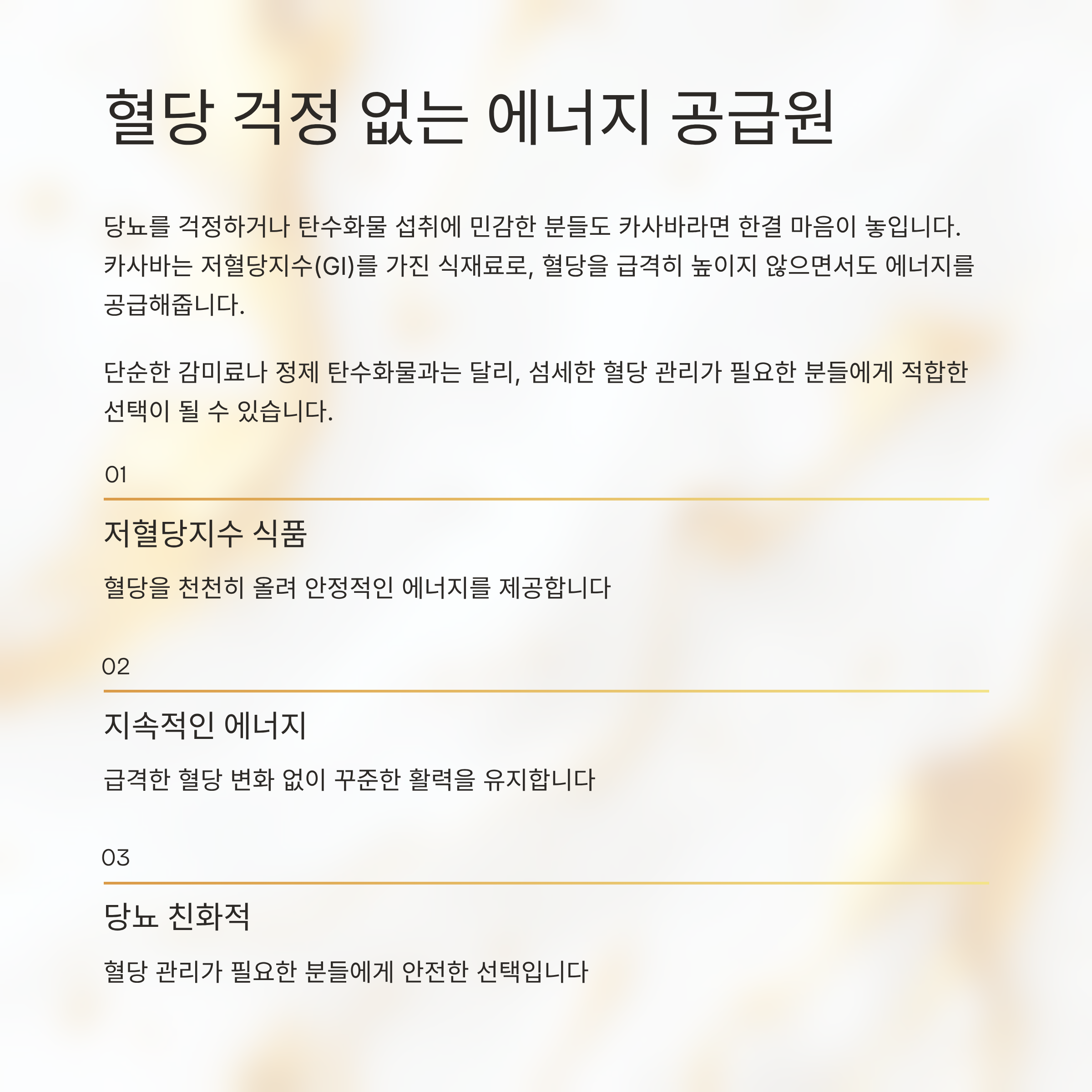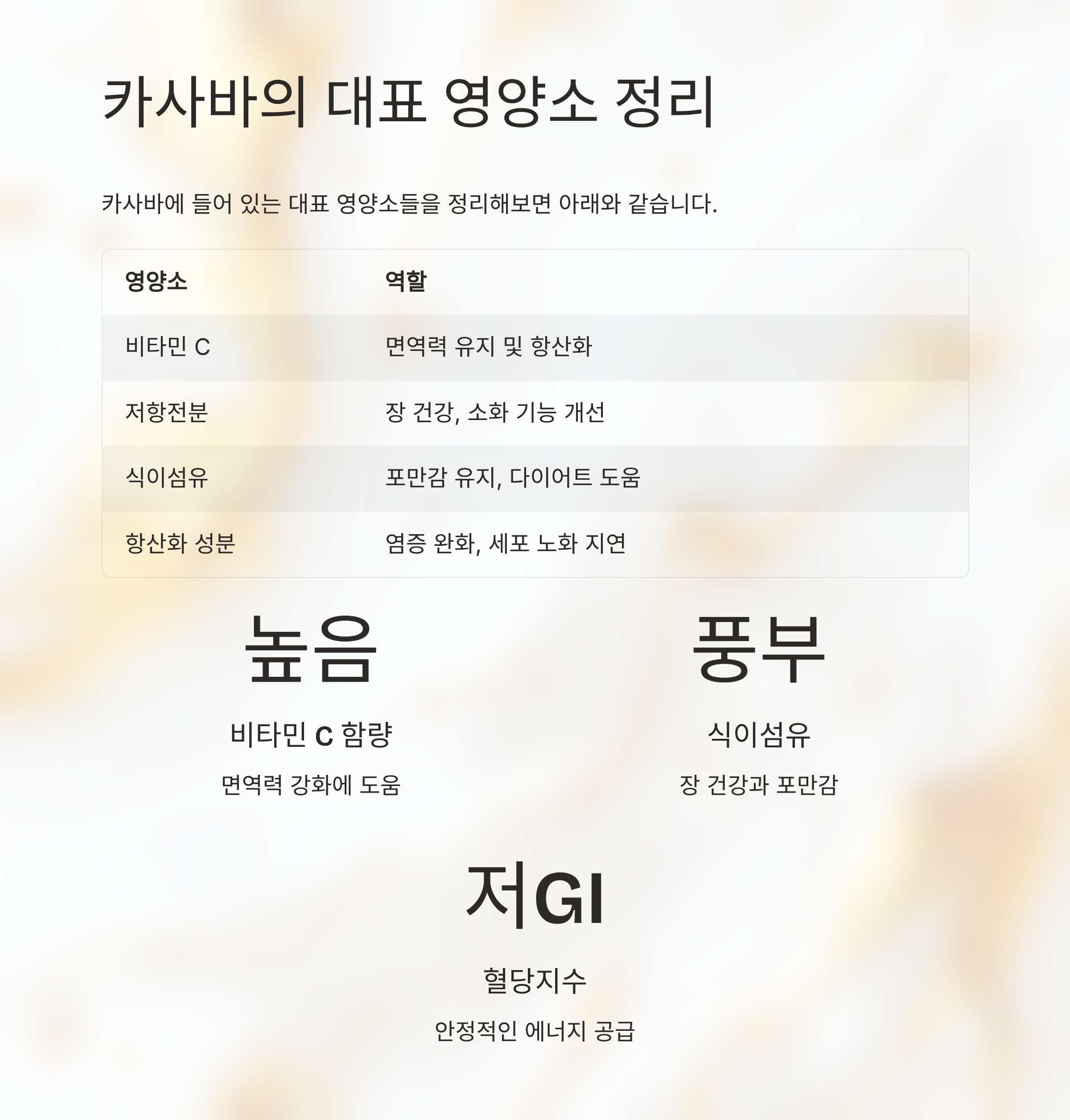 카사바는 저혈당지수(GI)를 가진 식재료로, 혈당을 급격히 높이지 않으면서도 에너지를 공급해줍니다.