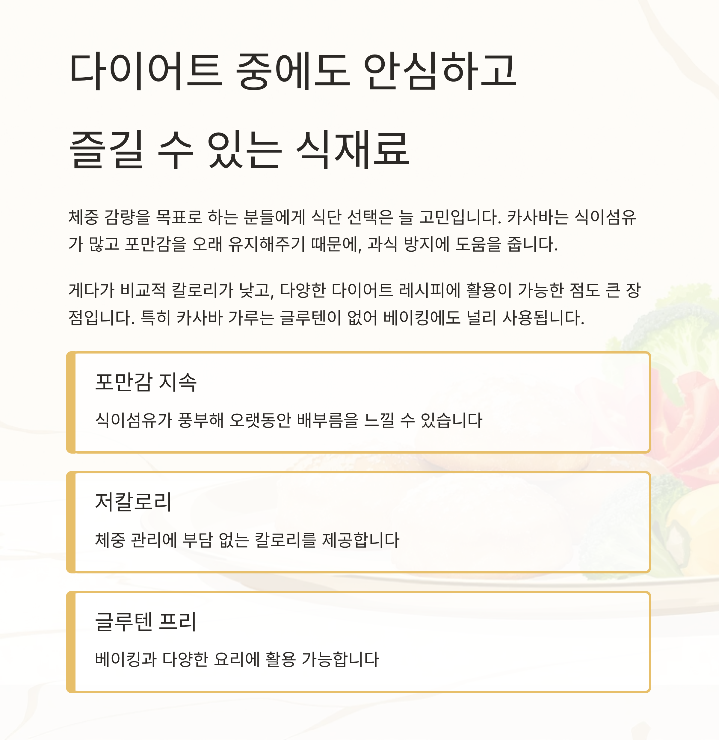 카사바는 식이섬유가 많고 포만감을 오래 유지해주기 때문에, 과식 방지에 도움을 줍니다.