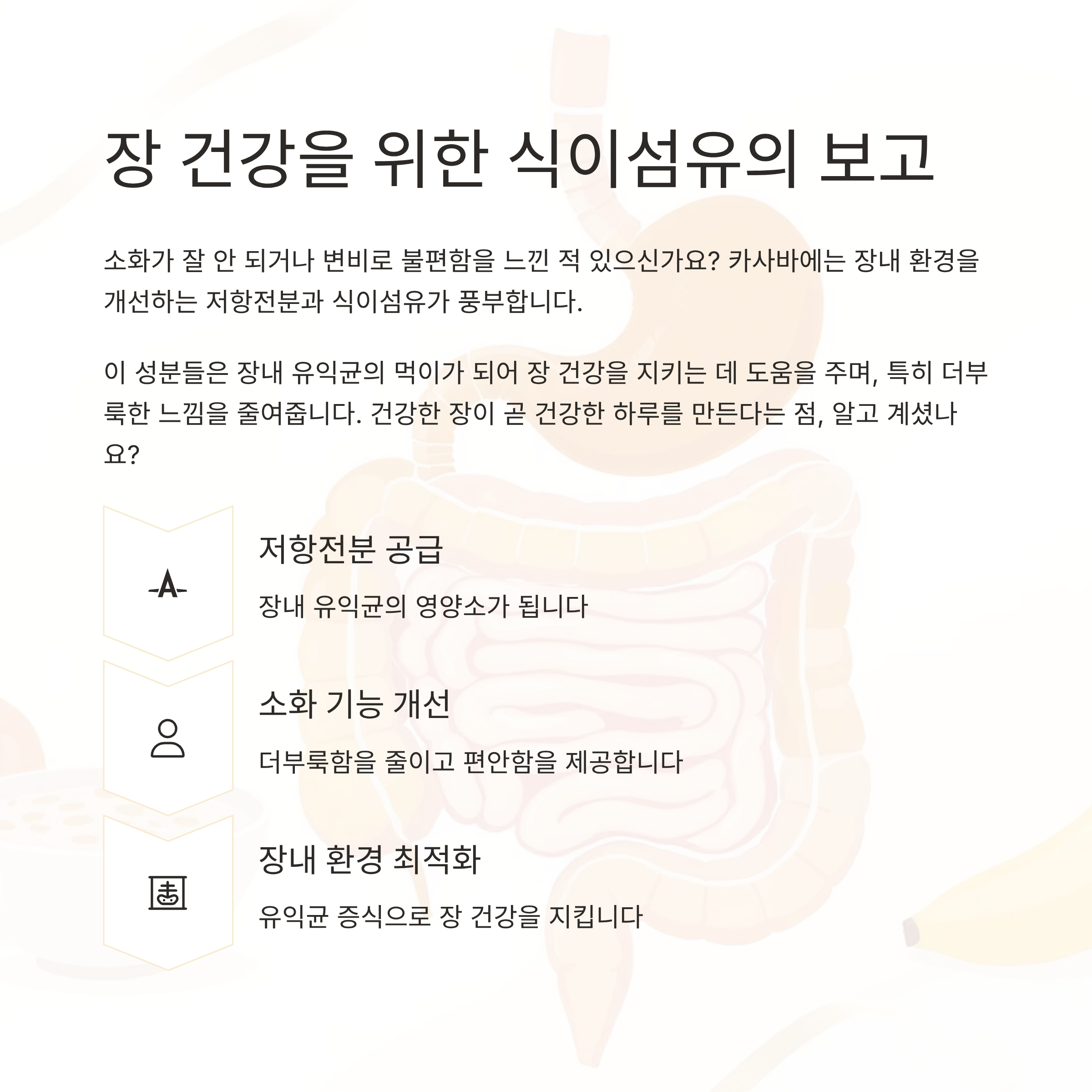 카사바에는 장내 환경을 개선하는 저항전분과 식이섬유가 풍부합니다.