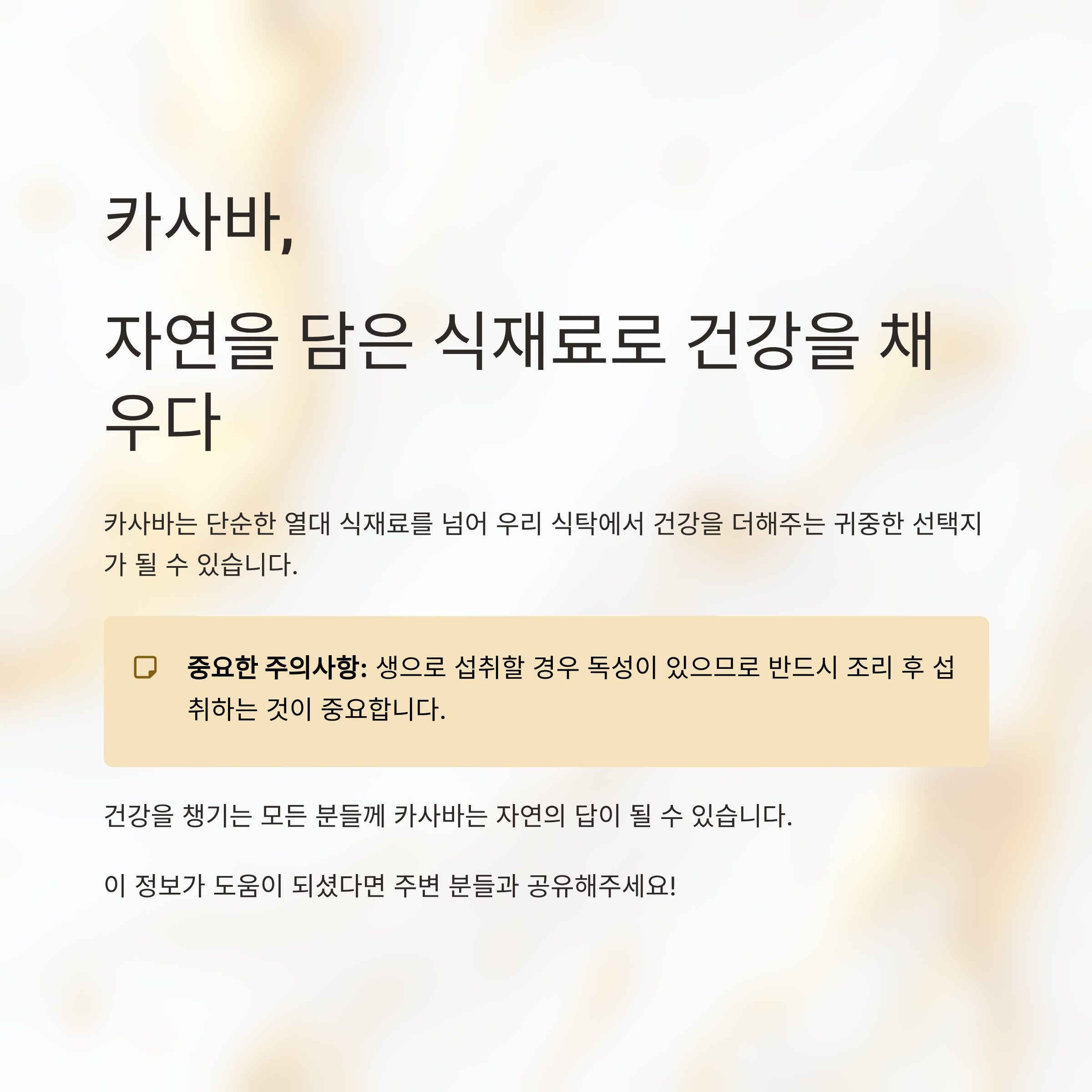 건강을 챙기는 모든 분들께 카사바는 자연의 답이 될 수 있습니다.
