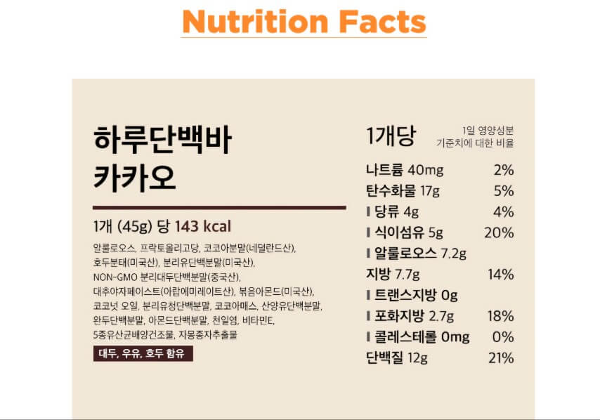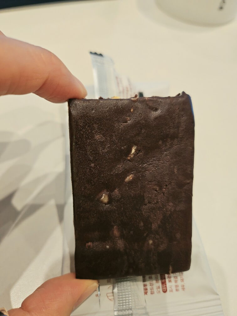 하루 단백바 카카오와 초코케이크맛 프로틴바는 비슷하지만, 하루 단백바 카카오가 더 꾸덕한 식감에 견과류 알맹이가 더 크게 박혀 있어 식감이 더 좋고 포만감도 더 있습니다.