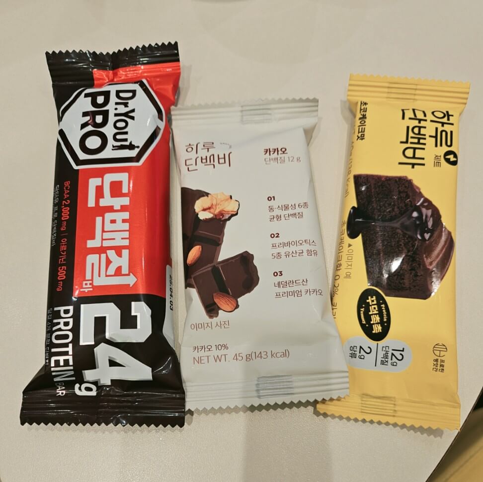 주로 3가지를 먹고 있는데, 모두 좋아하지만 프로틴방앗간의 하루 단백바 카카오를 제일 추천하고 싶습니다.