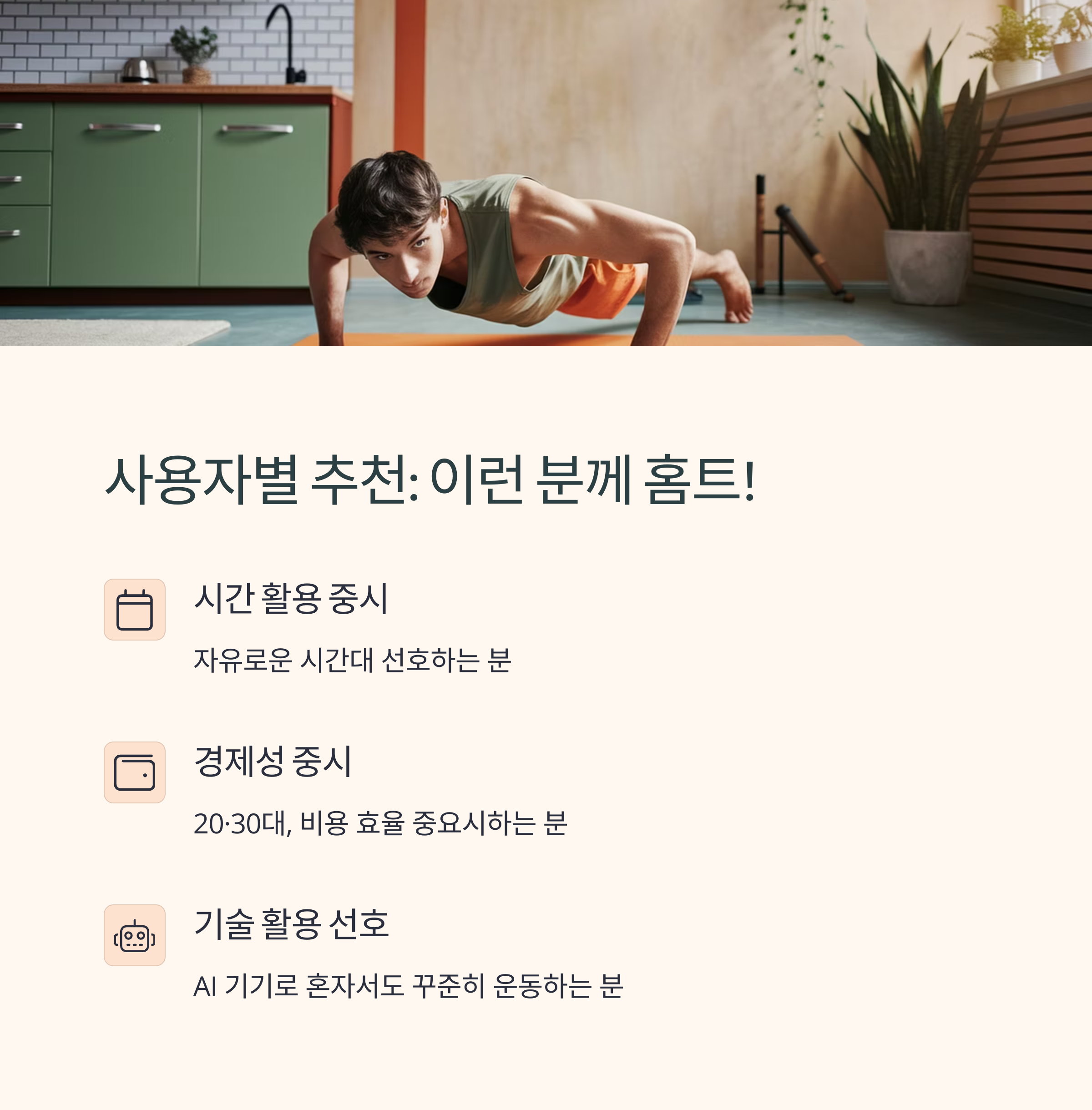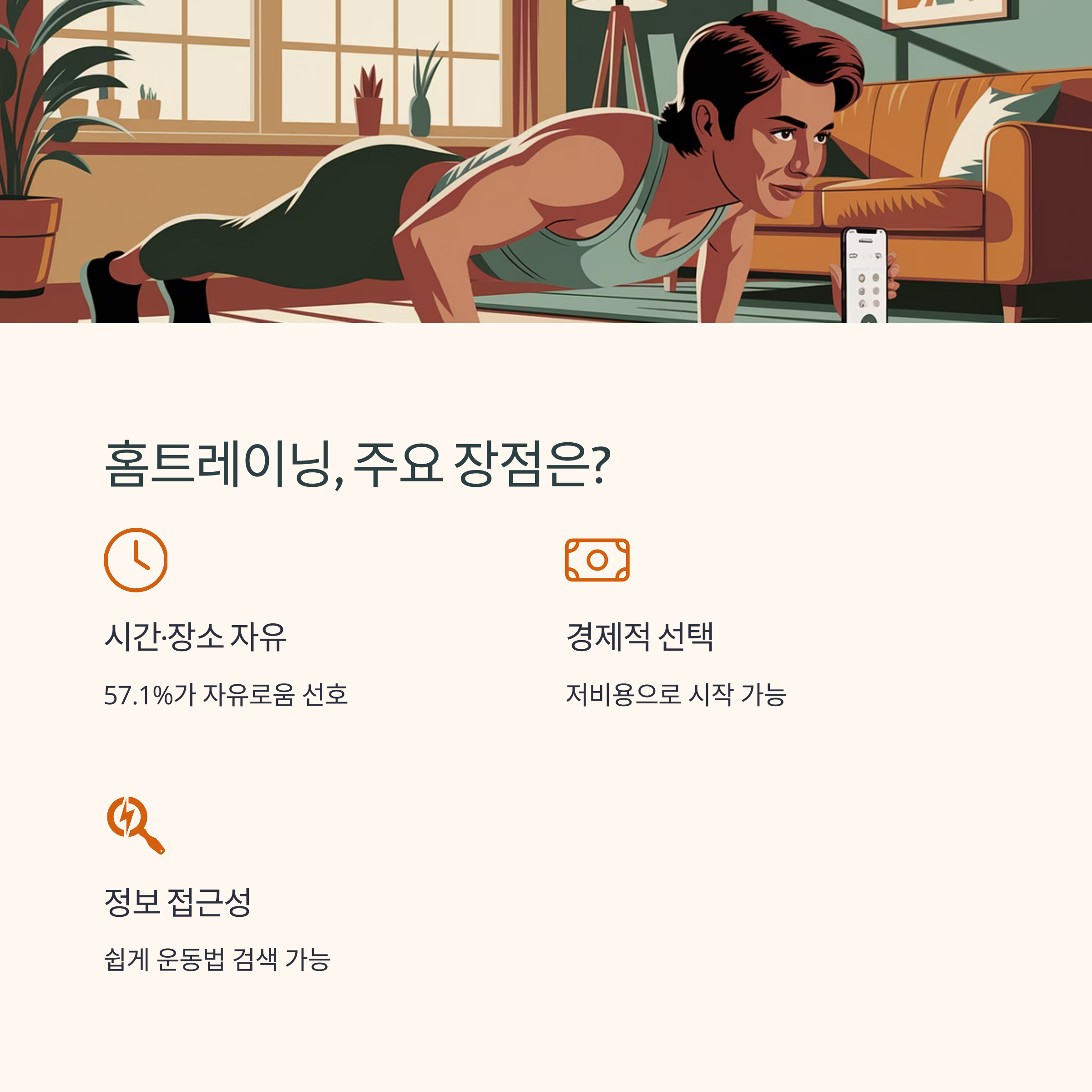 | 홈트레이닝 장점 | 시간과 장소 제한 없이 자유롭게 가능해요. |