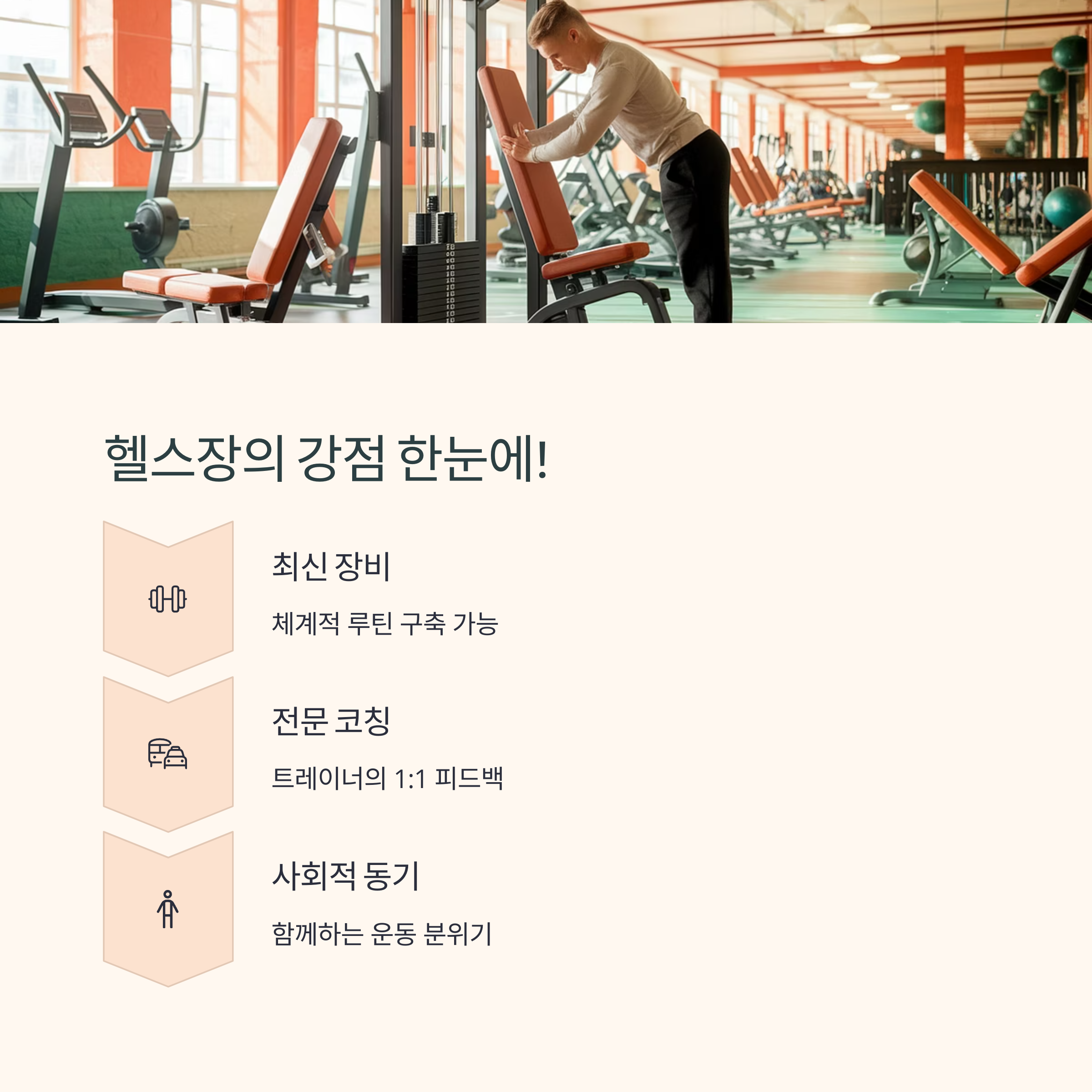 | 헬스장 장점 | 전문 장비와 트레이너의 코칭을 받을 수 있어요. |