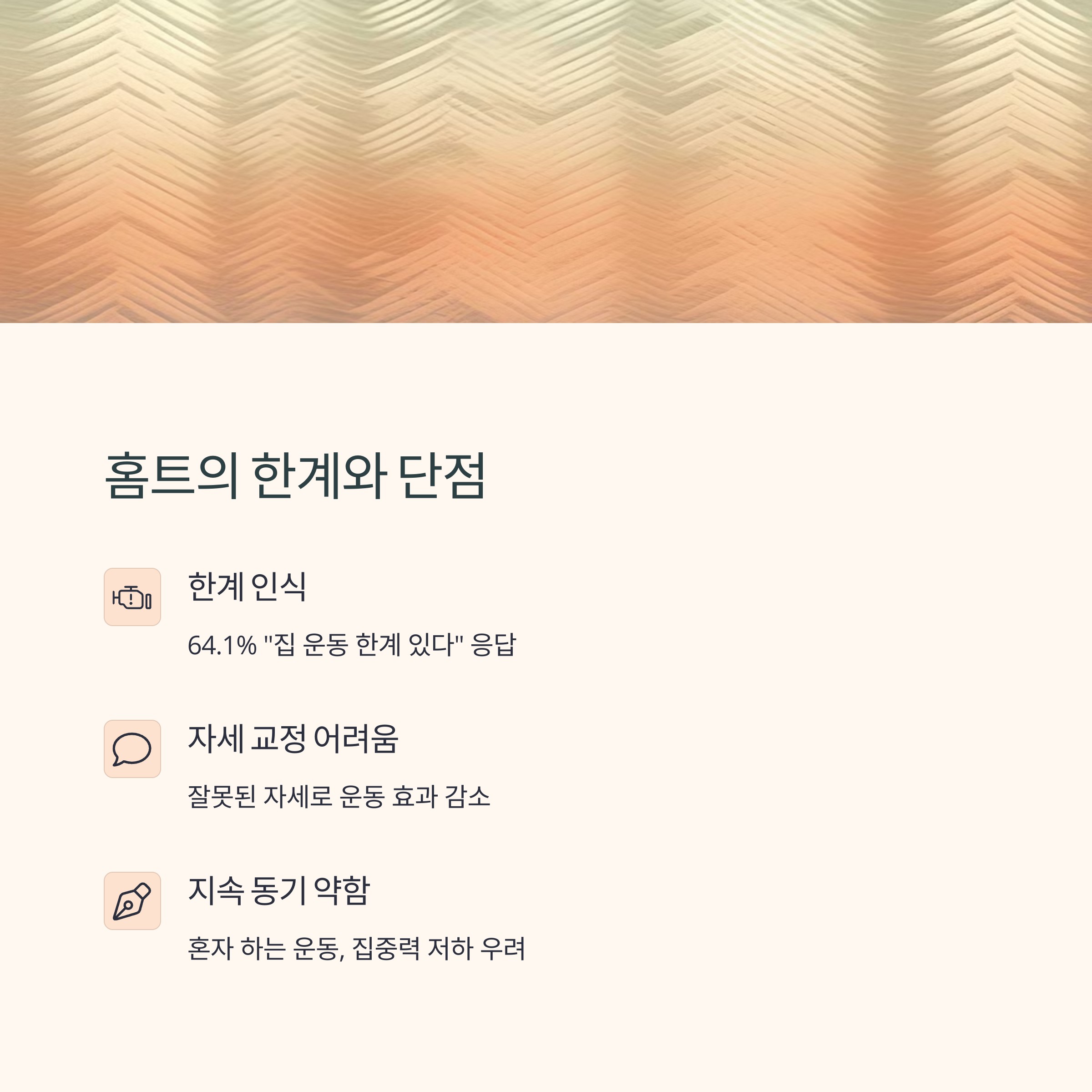 홈트레이닝은 시간과 공간의 제약이 적다는 점에서 매우 유리합니다. 아침에 일어나 10분만 투자해도 운동 루틴을 실행할 수 있으며 별도의 비용이 들지 않아 부담이 적습니다. 최근에는 AI 기반의 홈트 앱, 스마트 미러와 같은 기술이 보편화되면서 전문가의 도움이 없이도 자세 분석과 운동 추천이 가능해졌습니다. 하지만 집중력이 쉽게 흐트러질 수 있고, 자세 교정이 어려운 점은 단점으로 꼽히며, 초보자에게는 적절한 피드백이 부족할 수 있습니다.