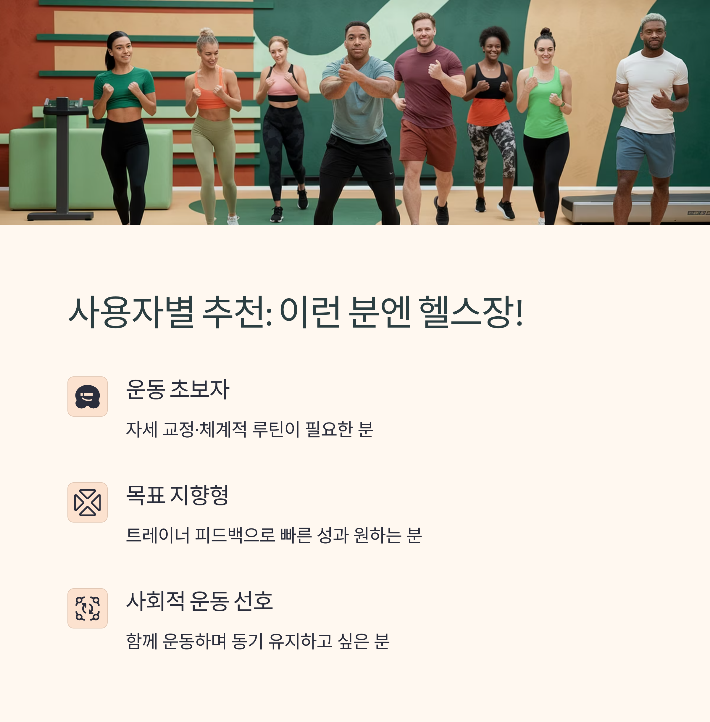| AI 기반 앱 활용으로 운동 효과를 높일 수 있어요. | 인바디 분석, PT 등 체계적인 관리 가능 | 지속 가능한 루틴 만들기가 핵심입니다. |